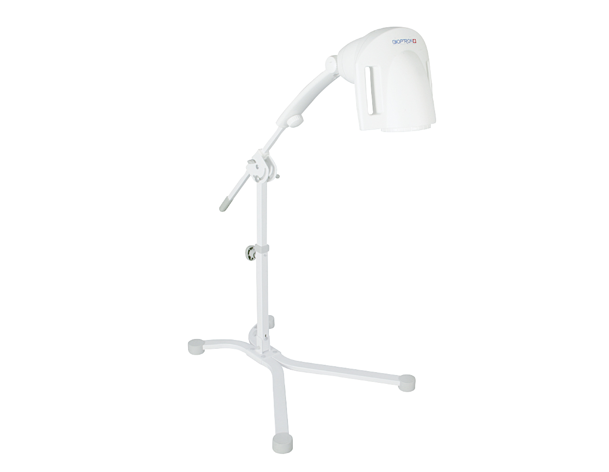 Este dispositivo está disponible con un soporte de suelo funcional y/o con un soporte de mesa ergonómico que flexibiliza su uso en entornos domésticos y profesionales. Su altura fácilmente ajustable y la inclinación del cabezal, así como el cabezal giratorio del dispositivo de hasta 360° permiten un uso cómodo en prácticamente cualquier posición. Los tratamientos pueden cronometrarse fácilmente a través del panel de control hasta un límite mínimo de 30 segundos. Una barra separadora incorporada permite mantener la distancia recomendada con la superficie de la piel. El soporte de mesa está equipado también con una funda antipolvo y una cómoda alfombrilla de soporte (desinfectable, intercambiable y lavable).